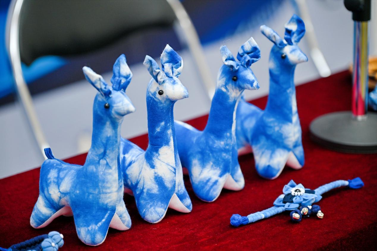 参与者各自发挥想象力,将手中的白色方巾用皮筋扎制成各种形态,并将捆扎好的布品放入靛蓝色的染缸中,期待着“魔法”的显现。经过一段时间的浸染、氧化、清洗和拆线,原本纯白的布料上逐渐呈现出变幻莫测、蓝白相间的美丽图案,无论是简约的几何图形,还是繁复的花纹,每一道纹路,都是时间写的诗句,带来“布”一样的惊喜。