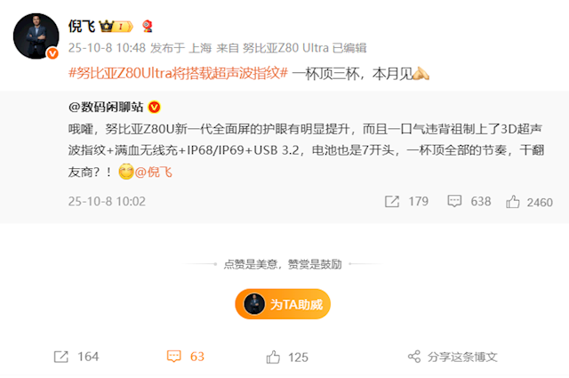 随后,中兴通讯终端事业部总裁、努比亚技术有限公司总裁倪飞转发称:“一杯顶三杯”。